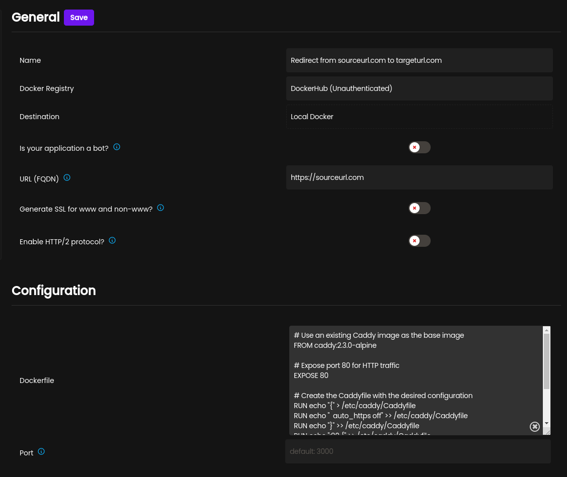 With the right Dockerfile, you can quickly and easily set up a custom HTTP redirect in Coolify.